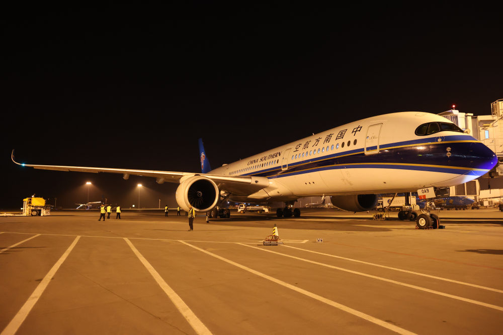 2024年4月24日晚,南航沈陽(yáng)-法蘭克福CZ8021首航航班在沈陽(yáng)桃仙國(guó)際機(jī)場(chǎng)準(zhǔn)備起飛。這是國(guó)內(nèi)航司在東北地區(qū)開通的首條直飛德國(guó)定期航線。