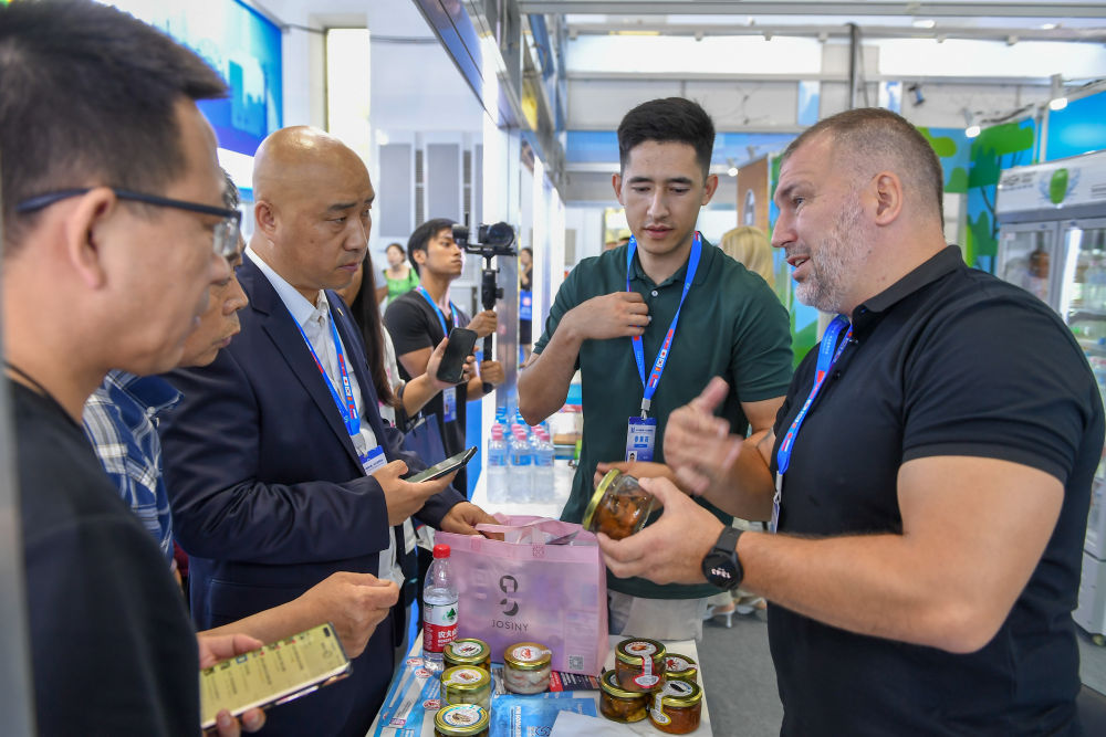 2023年8月23日,在第十四屆中國(guó)—東北亞博覽會(huì)東北亞商品館,俄羅斯參展商向參觀者介紹商品。