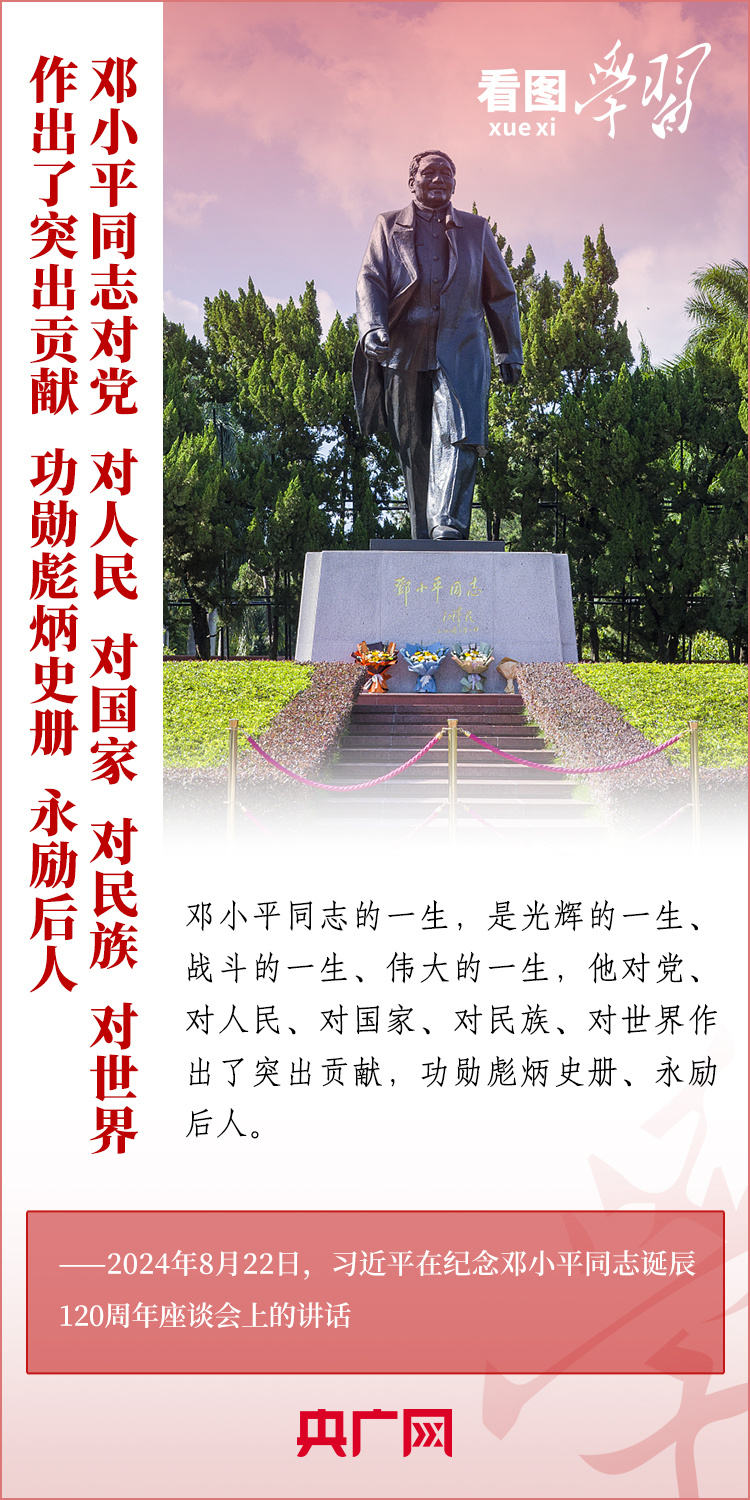 8月22日,習(xí)近平總書記在紀(jì)念鄧小平同志誕辰120周年座談會(huì)上發(fā)表重要講話指出,鄧小平同志的歷史功勛是全方位的、開創(chuàng)性的,對(duì)中國和世界的影響是深刻的、長遠(yuǎn)的??倳洀?qiáng)調(diào),對(duì)鄧小平同志最好的紀(jì)念,就是把他開創(chuàng)的中國特色社會(huì)主義事業(yè)繼續(xù)推向前進(jìn)。我們要緊緊圍繞以中國式現(xiàn)代化全面推進(jìn)強(qiáng)國建設(shè)、民族復(fù)興偉業(yè)這個(gè)中心任務(wù),繼往開來,奮發(fā)進(jìn)取。一起來學(xué)習(xí)!