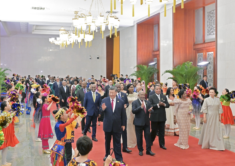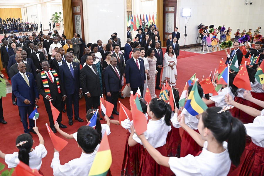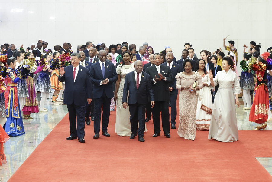 出席論壇峰會的51個非洲國家元首、政府首腦及配偶,2位總統代表,非盟委員會主席和聯合國秘書長等貴賓陸續(xù)抵達人民大會堂。習近平和彭麗媛熱情迎接,同他們分別握手問候,并集體合影留念。