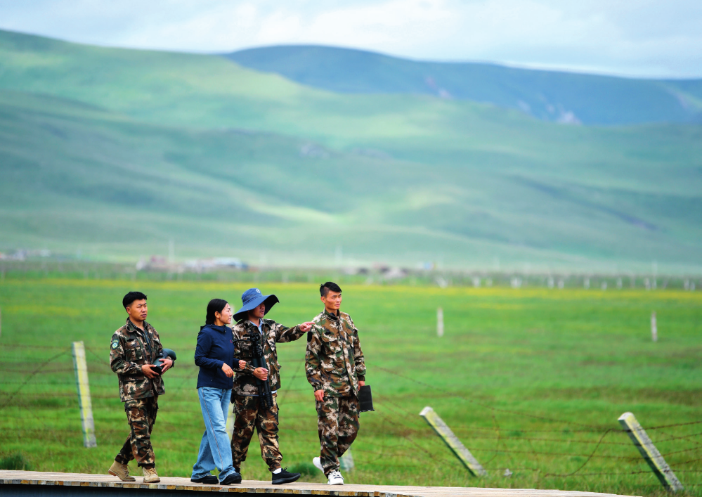 甘肅尕海則岔國家級自然保護區(qū)管護中心尕海保護站站長香毛吉 ( 左二)和同事在保護區(qū)內(nèi)巡護(2023 年 7 月 7 日攝)陳斌攝 / 本刊