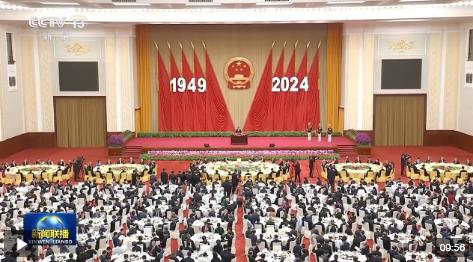 人民大會堂宴會廳華燈璀璨,洋溢著喜慶熱烈的節(jié)日氛圍。主席臺上方高懸著莊嚴的國徽,“1949-2024”大字年號在鮮艷紅旗映襯下格外醒目。