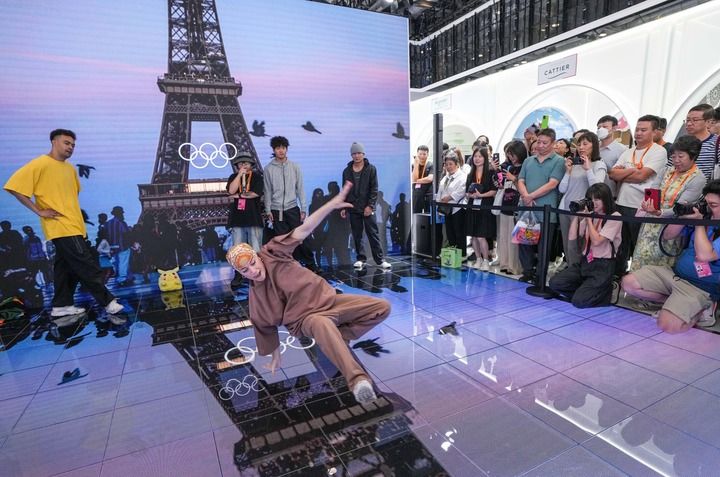 2024年9月14日,在2024年服貿(mào)會(huì)國(guó)家會(huì)議中心綜合展區(qū)的主賓國(guó)法國(guó)展臺(tái),中法兩國(guó)街舞好手在表演霹靂舞。