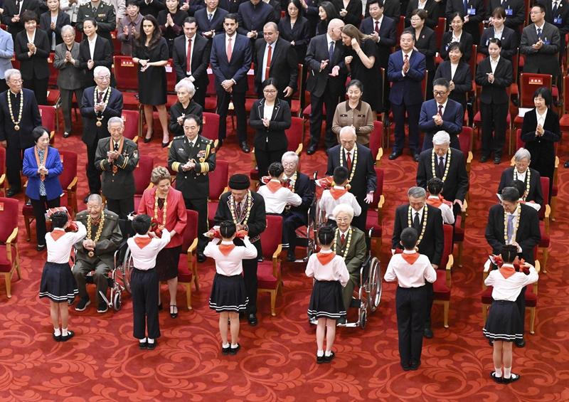 2024年9月29日,少先隊員向國家勛章和國家榮譽稱號獲得者敬禮致意。