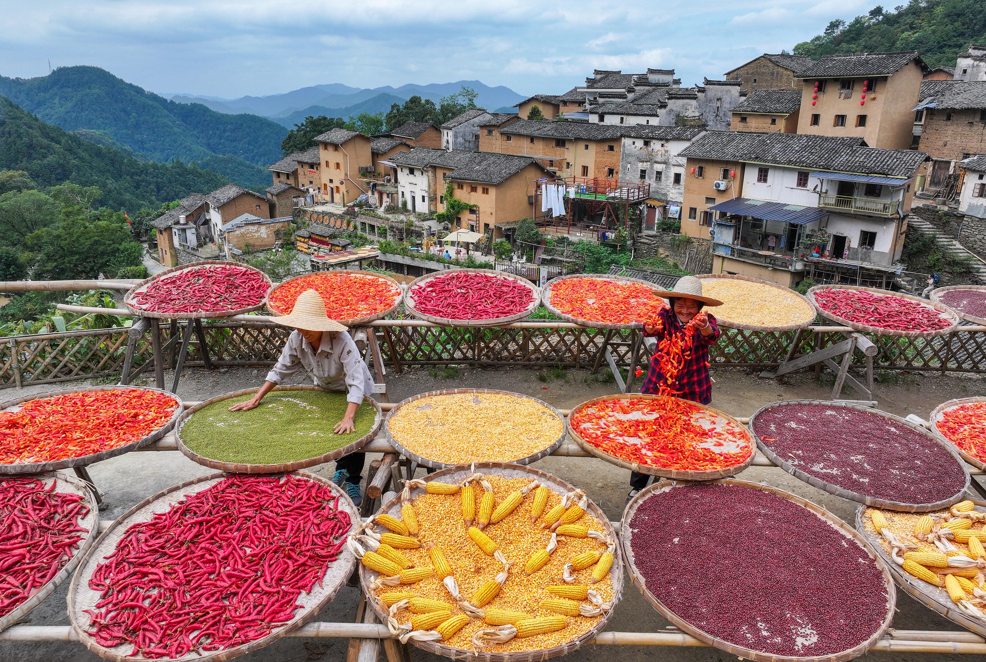 2024年9月22日,安徽省黃山市歙縣陽(yáng)產(chǎn)村,村民正在土樓前晾曬農(nóng)作物。