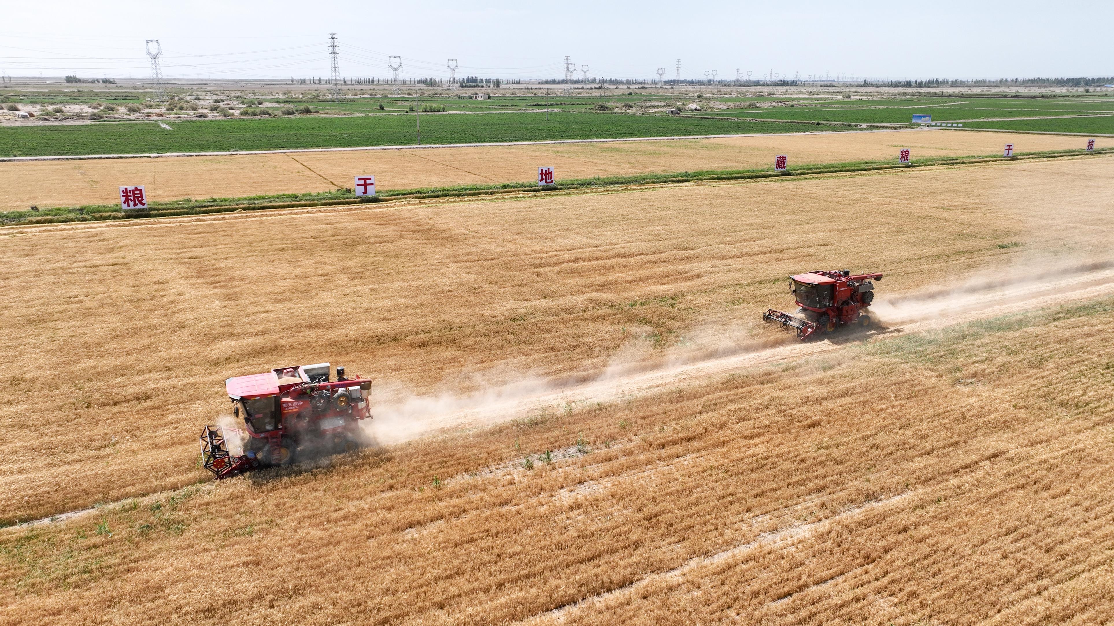 2024年7月10日,在甘肅省酒泉市金塔縣東壩鎮(zhèn)小河口村中度鹽堿耕地綜合治理利用示范點(diǎn),1000余畝鹽堿地小麥喜獲豐收。