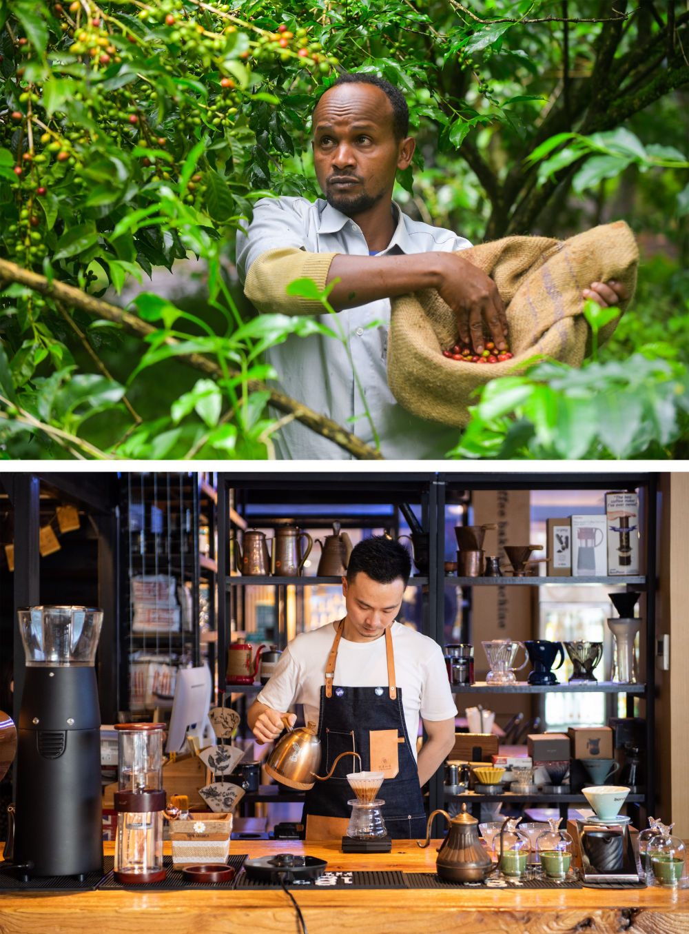 上圖:2021年9月22日,在埃塞俄比亞奧羅米亞州戈馬地區(qū)的一個(gè)咖啡園,農(nóng)民胡森·穆罕默德在采摘咖啡豆;下圖:2021年9月24日,在湖南省長沙市高橋大市場(chǎng)非洲咖啡街一家咖啡館,咖啡師彭杰在制作咖啡飲品。隨著中國開放的大門越開越大、中國咖啡消費(fèi)的快速增長,埃塞俄比亞咖啡在中國越來越受歡迎。