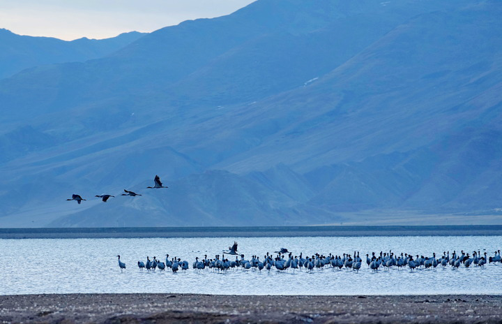 在雅魯藏布江中游河谷黑頸鶴國家級自然保護(hù)區(qū),黑頸鶴飛翔在一片水域上空(2024年3月17日攝)。多年來,西藏各級黨委政府和對口援藏省市接續(xù)投入2.4億余元資金開展生態(tài)建設(shè),創(chuàng)設(shè)的雅江北岸南木林生態(tài)示范區(qū)已完成造林4萬多畝,昔日戈壁荒灘漸變江畔綠洲,也成了黑頸鶴越冬的理想棲息地。監(jiān)測數(shù)據(jù)顯示,西藏境內(nèi)的黑頸鶴種群數(shù)量持續(xù)增長,已由上世紀(jì)的不足3000只增長到目前的1萬余只。