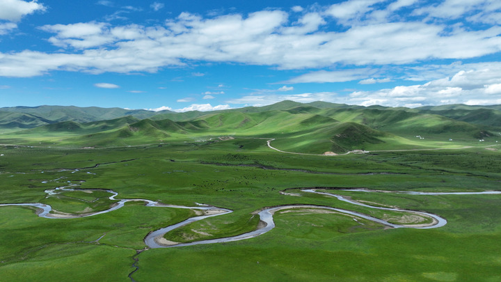 這是2023年7月6日拍攝的甘肅省甘南藏族自治州瑪曲縣阿萬倉濕地景色(無人機(jī)照片)。瑪曲縣是黃河上游重要的水源涵養(yǎng)區(qū)和生態(tài)功能區(qū),被稱為“黃河之腎”。多年來,甘肅省實施退牧還草、退化草原生態(tài)修復(fù)等治理工程,草原生態(tài)環(huán)境明顯改善。
