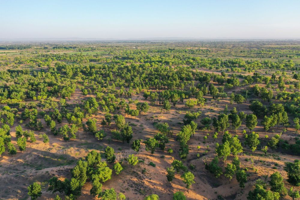 2023年6月14日在內(nèi)蒙古毛烏素沙地拍攝的當(dāng)?shù)啬撩穹N植的一片樹林(無人機(jī)照片)。2024年以來,內(nèi)蒙古全面開展“三北”工程攻堅戰(zhàn),已完成防沙治沙面積約1954萬畝,約為年度總?cè)蝿?wù)1730萬畝的113%,超額完成年度任務(wù)。