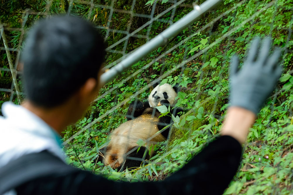 2024年6月24日,在位于大熊貓國家公園臥龍片區(qū)內(nèi)天臺山的大熊貓第二階段野化培訓(xùn)場外,工作人員給母熊貓“賢賢”投喂完食物后揮手向其告別。近年來,我國通過大力實施天然林保護(hù)、野生動植物保護(hù)和大熊貓國家公園建設(shè)等,保護(hù)大熊貓及其棲息地,成效顯著。大熊貓野外種群總量已從20世紀(jì)80年代的約1100只增長到近1900只。