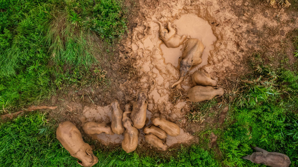 2024年8月8日,“短鼻家族”和“然然家族”的野象在云南省西雙版納州景洪市大渡崗鄉(xiāng)的泥塘里玩耍(無人機(jī)照片)。近年來,云南修復(fù)改造了一些大象棲息地,種植大象愛吃的植物,同時運(yùn)用紅外相機(jī)等技術(shù)手段,實現(xiàn)亞洲象位置信息的實時發(fā)布。