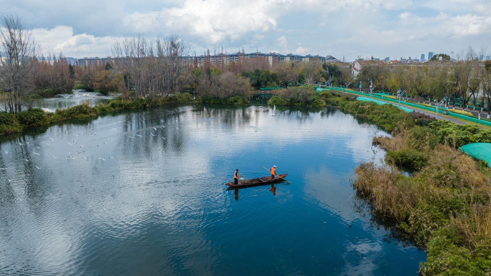 2024年1月16日,管護(hù)人員在滇池打撈雜物(無人機(jī)照片)。據(jù)昆明市滇池管理局介紹,2023年滇池全湖水質(zhì)持續(xù)向好,自2018年上升為Ⅳ類水質(zhì)后,連續(xù)六年保持全湖水質(zhì)Ⅳ類。
