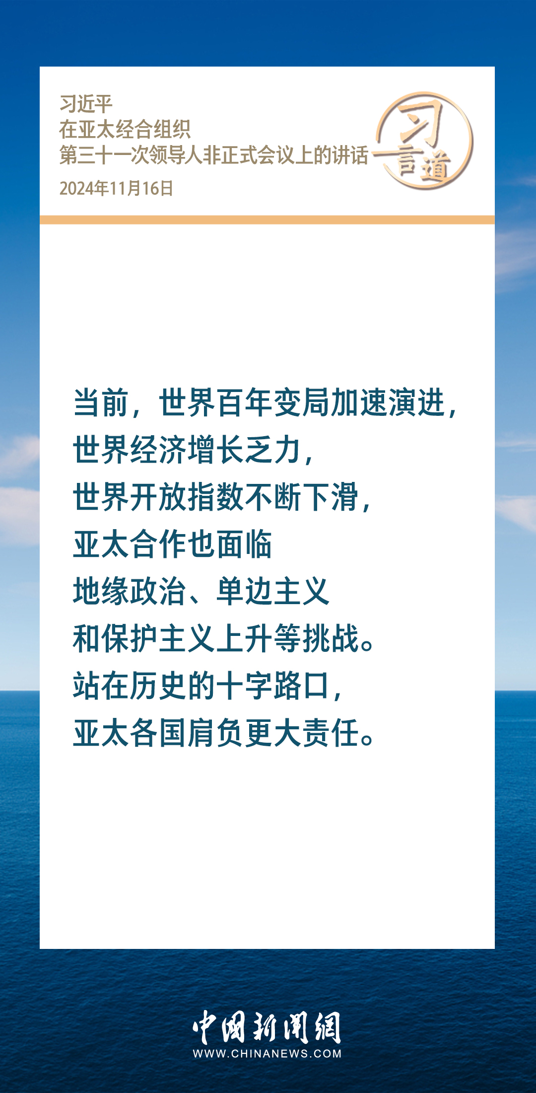 當(dāng)?shù)貢r(shí)間11月16日,國家主席習(xí)近平出席亞太經(jīng)合組織第三十一次領(lǐng)導(dǎo)人非正式會議并發(fā)表重要講話。習(xí)近平指出——