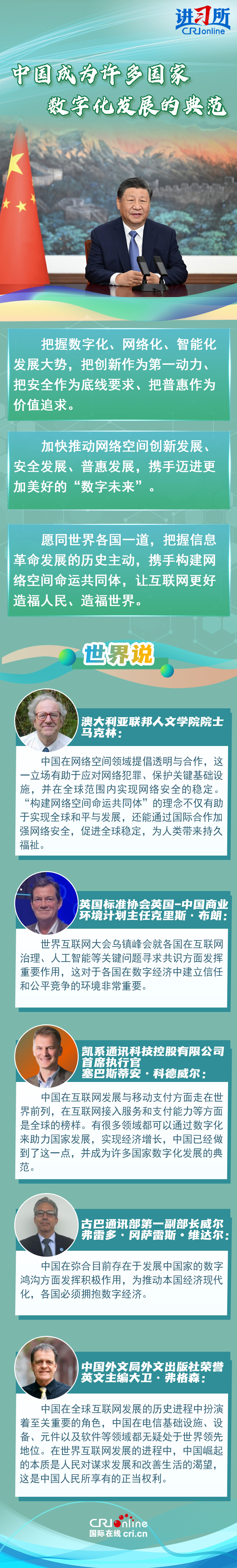 多國人士表示,中國在全球互聯(lián)網發(fā)展的歷史進程中扮演著至關重要的角色,“構建網絡空間命運共同體”的理念不僅有助于實現(xiàn)全球和平與發(fā)展,還能為人類帶來持久福祉。