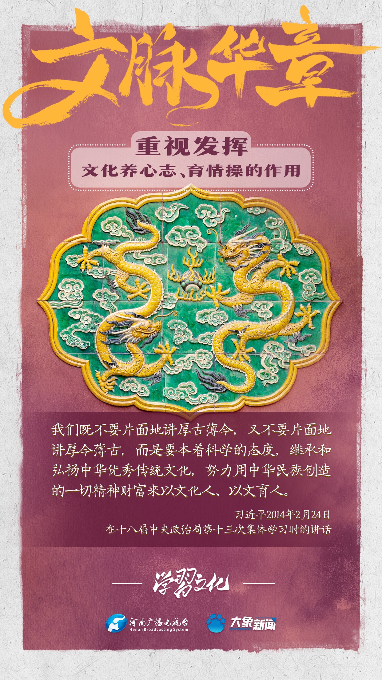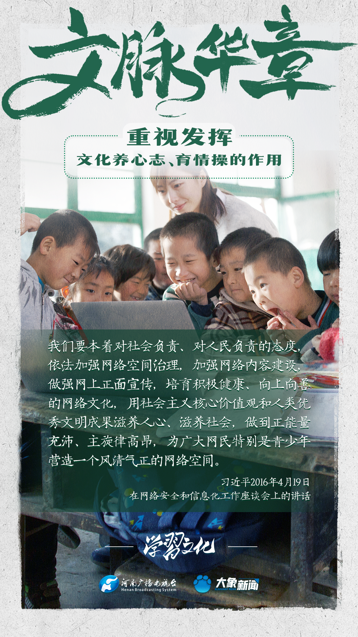 習(xí)近平總書(shū)記在主持中共中央政治局第十七次集體學(xué)習(xí)時(shí)強(qiáng)調(diào),重視發(fā)揮文化養(yǎng)心志、育情操的作用,涵養(yǎng)全民族昂揚(yáng)奮發(fā)的精神氣質(zhì)??倳?shū)記高度重視文化的作用,發(fā)表了一系列重要講話,倡導(dǎo)以文載道、以文傳聲、以文化人。我們一起學(xué)習(xí)。