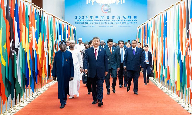 △2024年9月5日,習(xí)近平主席在北京人民大會堂出席中非合作論壇北京峰會開幕式并發(fā)表主旨講話。這是習(xí)主席同外方領(lǐng)導(dǎo)人共同步入會場。