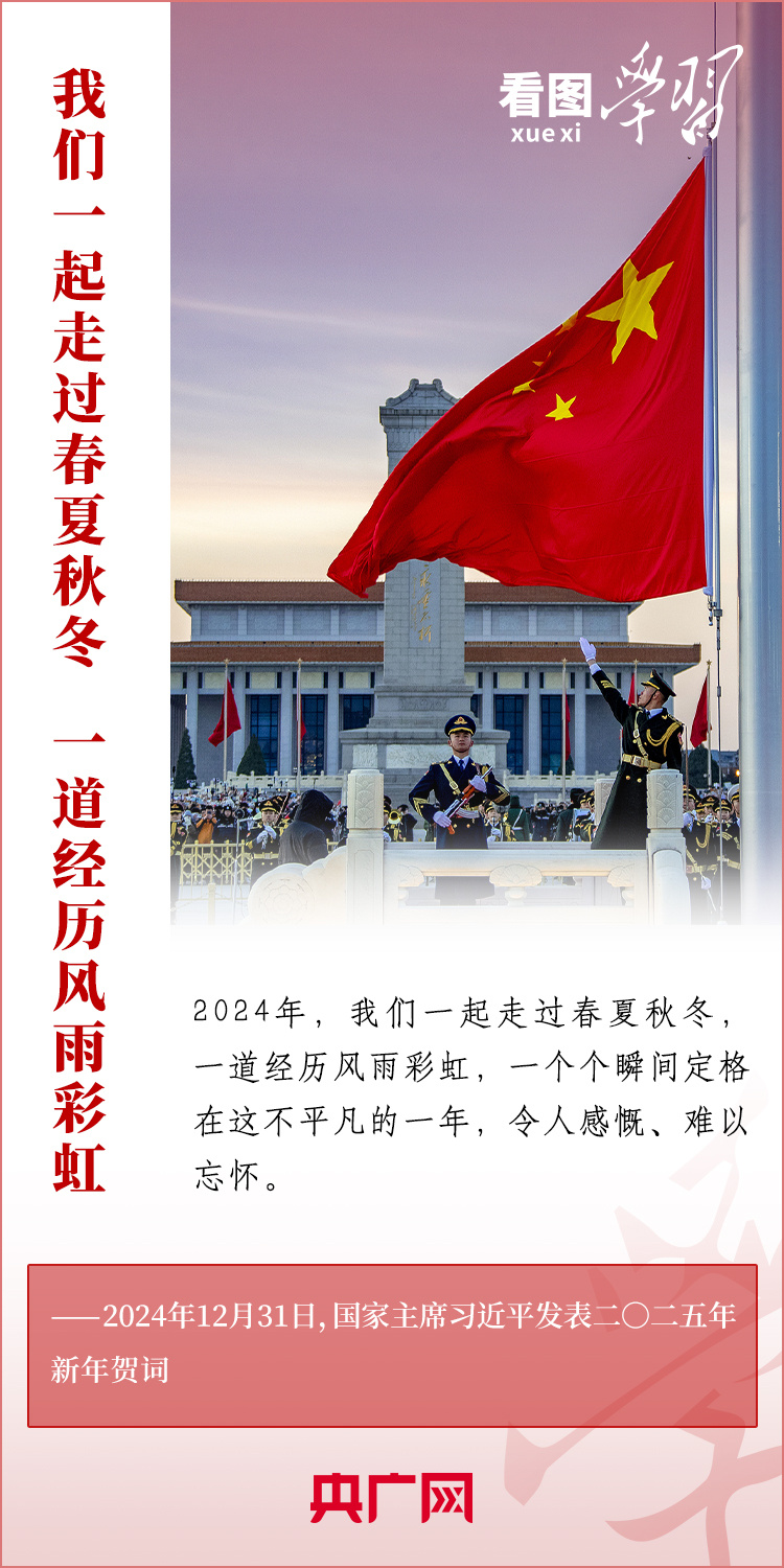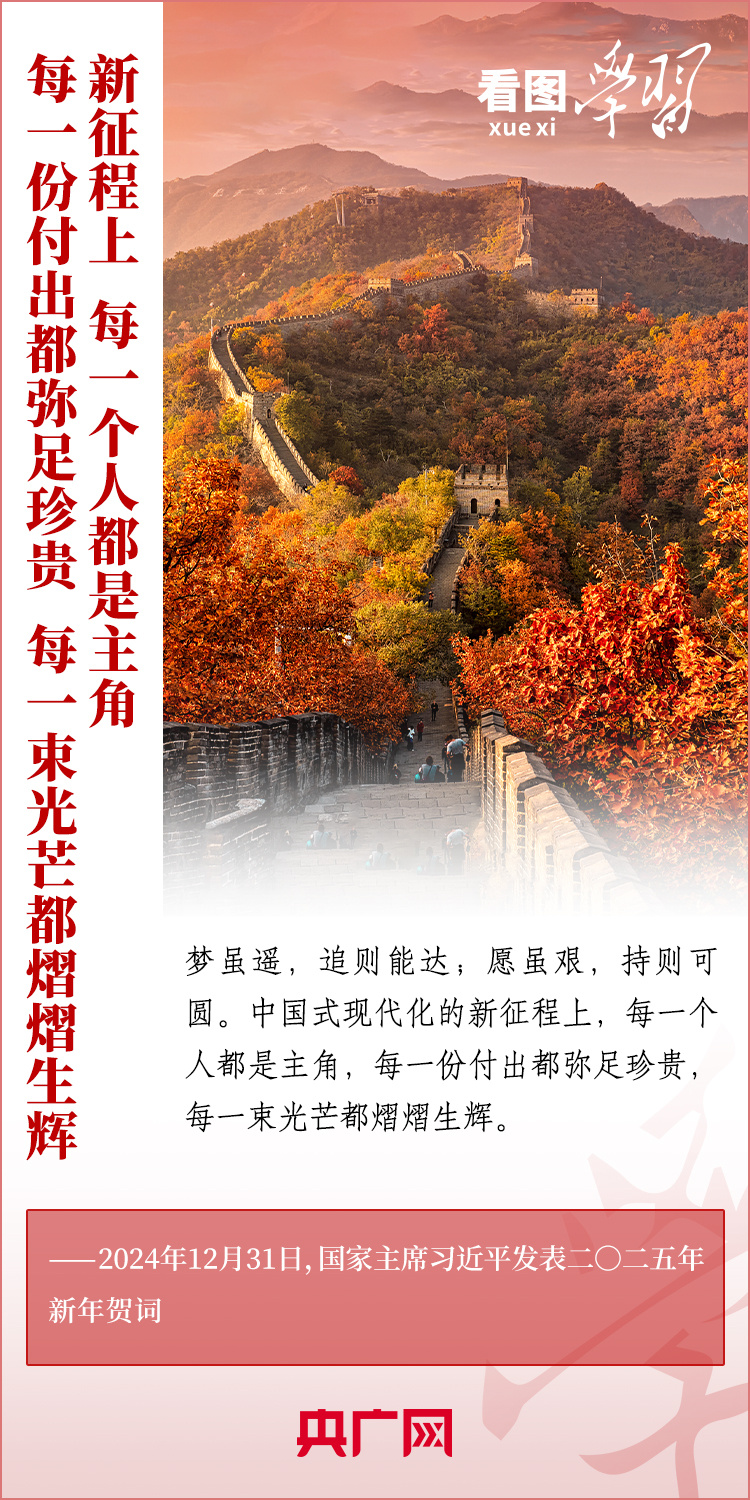 “夢(mèng)雖遙,追則能達(dá);愿雖艱,持則可圓。”新年前夕,習(xí)近平主席發(fā)表二〇二五年新年賀詞。在溫暖有力的講述中,習(xí)主席深情回望過去一年中國(guó)不平凡的奮斗歷程、精彩瞬間,感慨大家一道經(jīng)歷的風(fēng)雨彩虹、難忘時(shí)刻,贊美無(wú)數(shù)為夢(mèng)想拼搏的勞動(dòng)者、建設(shè)者、創(chuàng)業(yè)者。習(xí)主席說,中國(guó)式現(xiàn)代化的新征程上,每一個(gè)人都是主角,每一份付出都彌足珍貴,每一束光芒都熠熠生輝。讓我們充滿信心,在新的一年接續(xù)奮斗!