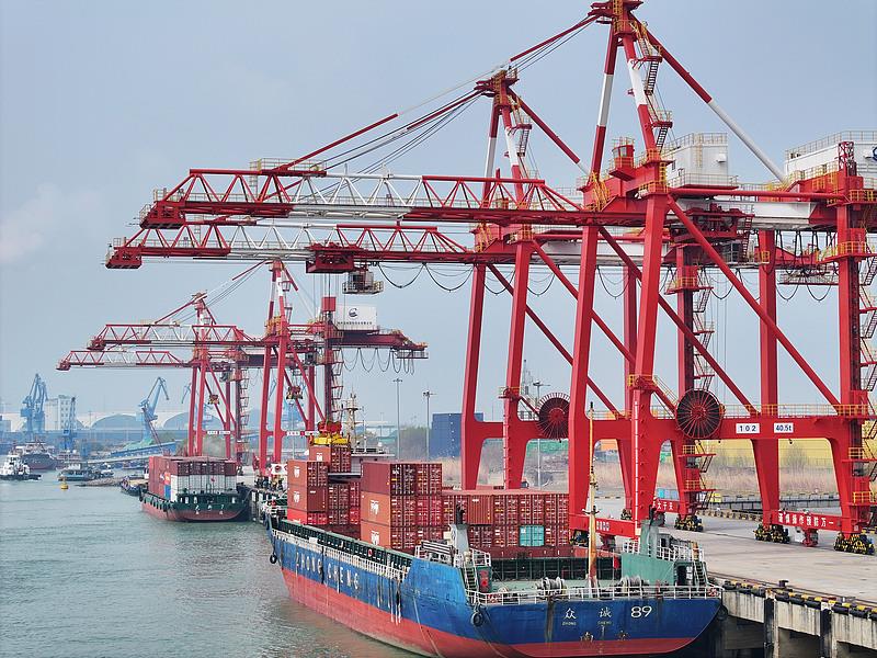 江蘇揚(yáng)州港,貨輪靠泊在港口裝卸貨物。
