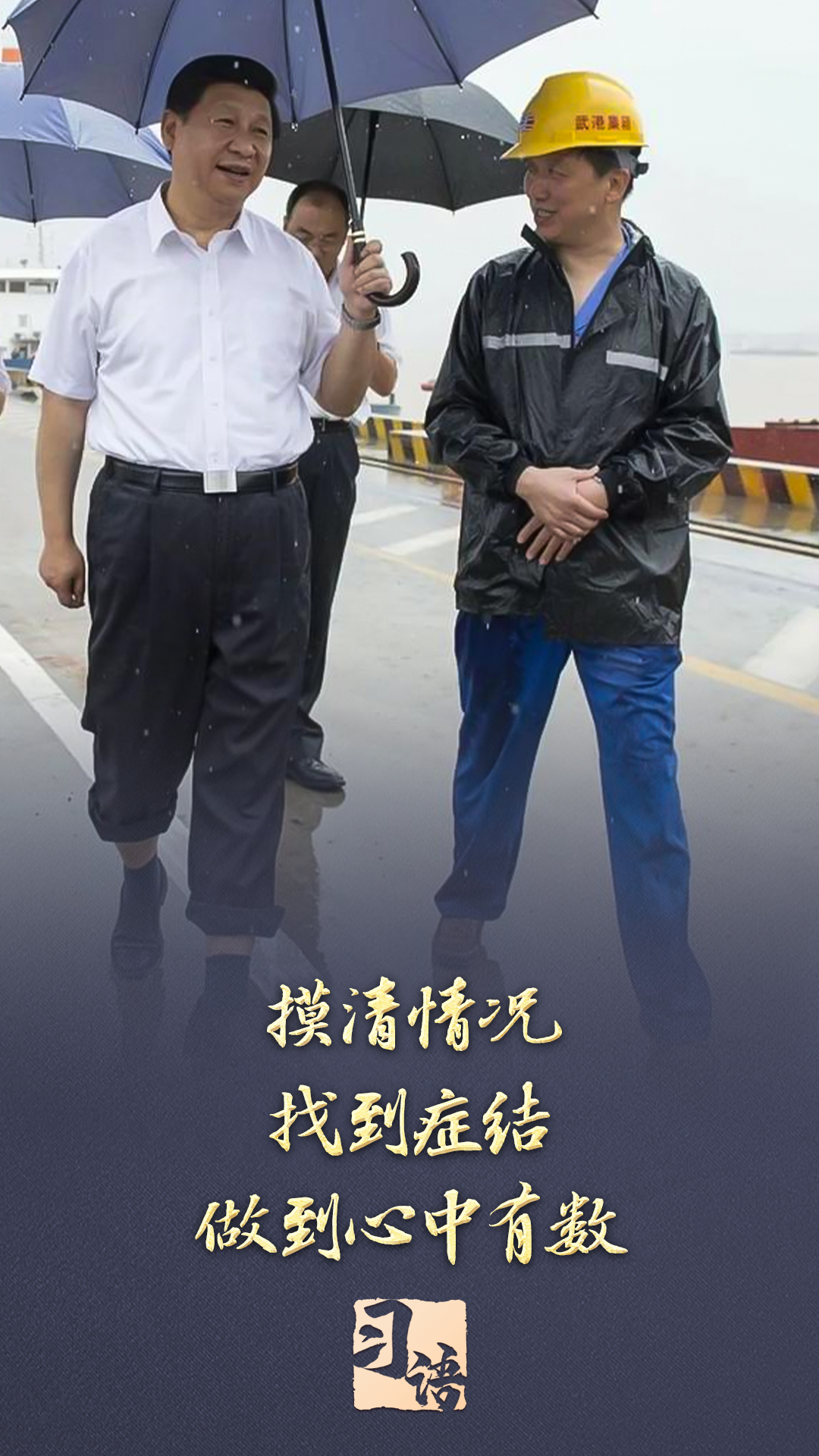 2013年7月,習(xí)近平總書記冒雨來到湖北武漢新港陽邏集裝箱港區(qū)考察,他卷起褲腿,打著雨傘,蹚著積水邊走邊看邊問。兩天后,在武漢主持召開部分省市負責(zé)人座談會時,習(xí)近平總書記強調(diào):“研究、思考、確定全面深化改革的思路和重大舉措,刻舟求劍不行,閉門造車不行,異想天開更不行,必須進行全面深入的調(diào)查研究?!?/p>