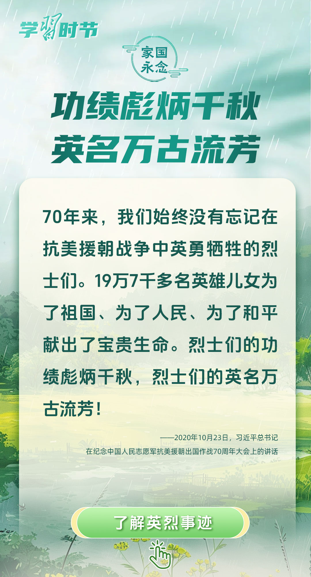 今年是中國人民抗日戰(zhàn)爭暨世界反法西斯戰(zhàn)爭勝利80周年、中國人民志愿軍抗美援朝出國作戰(zhàn)75周年。習(xí)近平總書記曾說:“對一切為國家、為民族、為和平付出寶貴生命的人們,不管時代怎樣變化,我們都要永遠(yuǎn)銘記他們的犧牲和奉獻(xiàn)。”今天我們所擁有的一切,無不凝結(jié)著英雄、英烈們的奉獻(xiàn)付出乃至巨大犧牲。