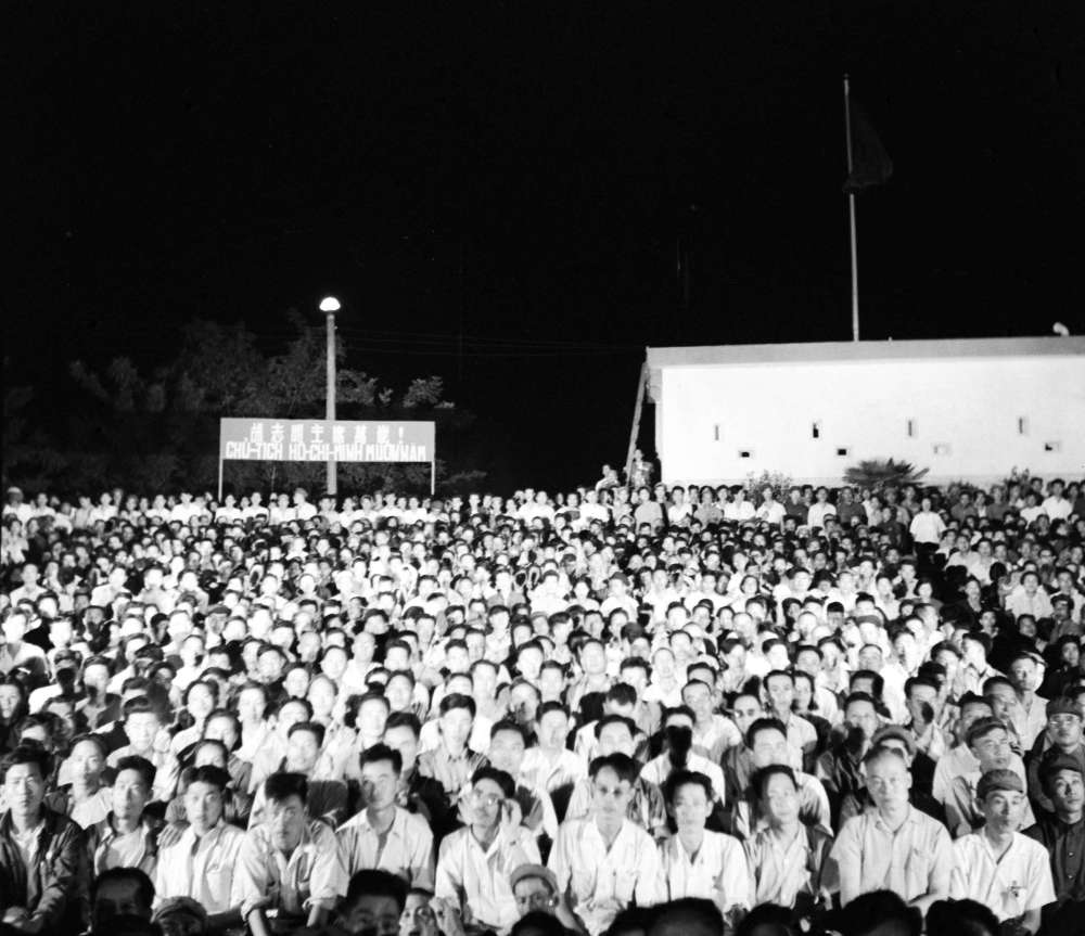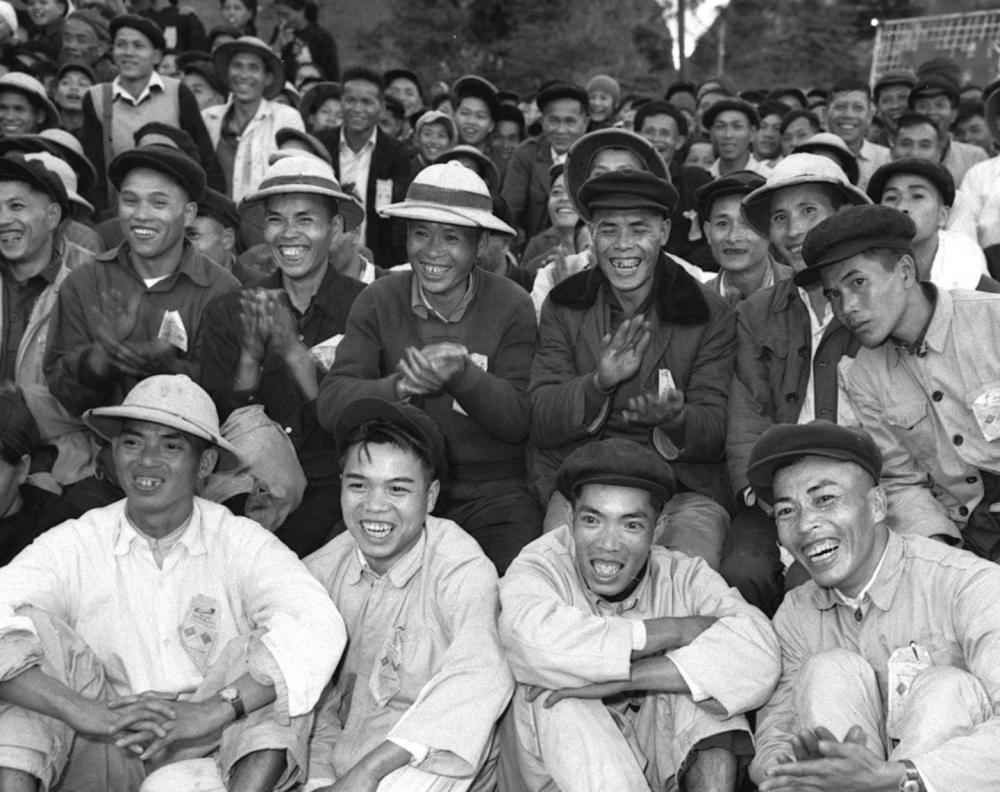 1959年12月,來自越南的客人在兩國邊境居民慶祝共建水利工程完工聯(lián)歡會(huì)上觀看演出。