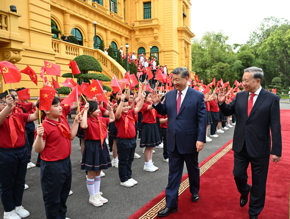 越共中央總書記蘇林為對越南進(jìn)行國事訪問的中共中央總書記、國家主席習(xí)近平舉行隆重歡迎儀式,兩位領(lǐng)導(dǎo)人在紅毯上并肩前行。