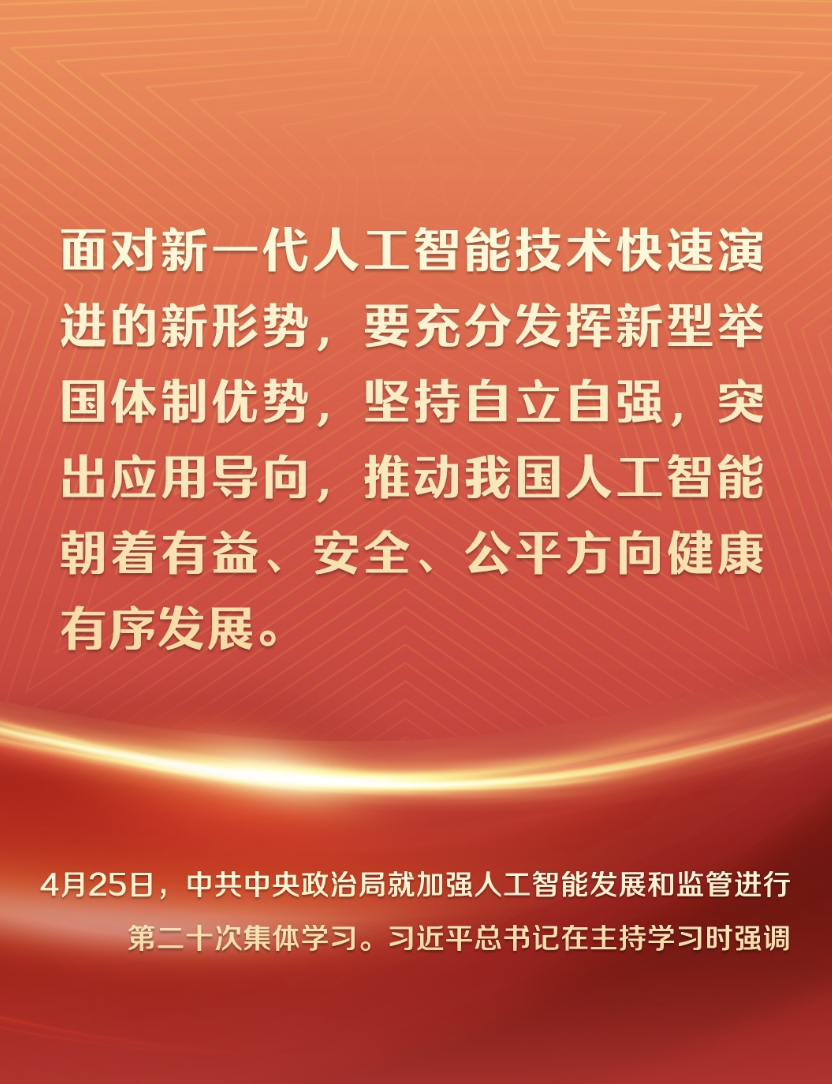 就在4天前,4月25日下午,中共中央政治局就加強人工智能發(fā)展和監(jiān)管進行第二十次集體學習。習近平總書記在主持學習時強調: