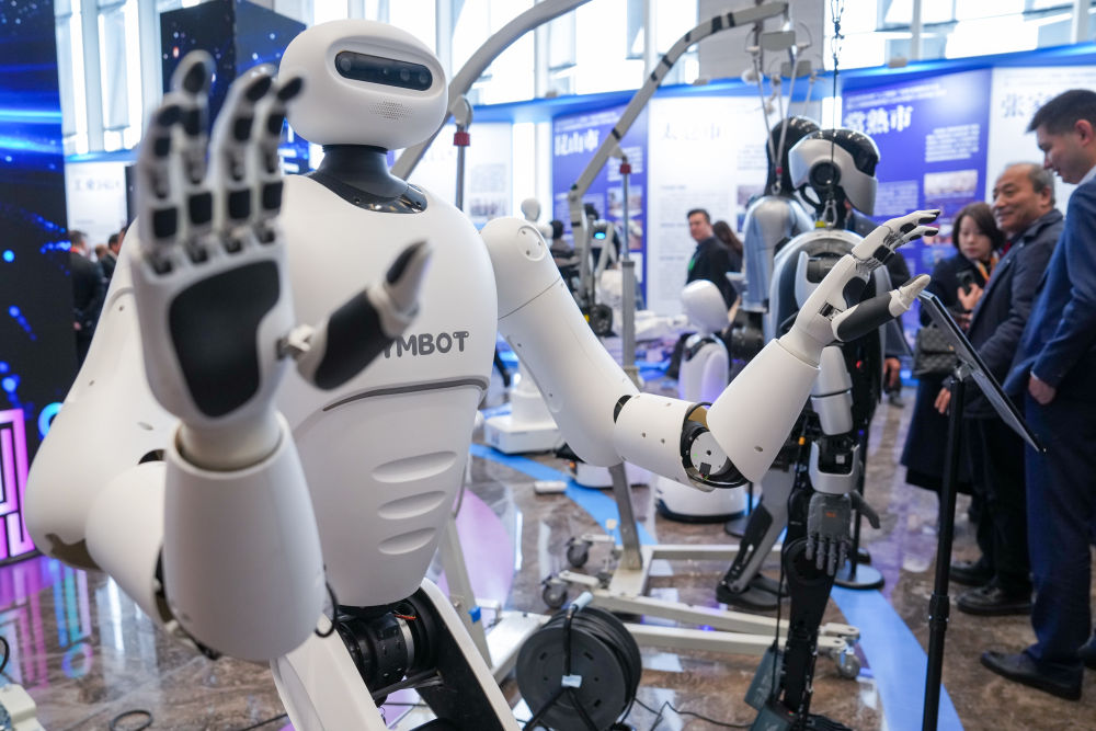 2025年2月14日,在2025年蘇州市“人工智能+”創(chuàng)新發(fā)展推進大會暨人工智能賦能新型工業(yè)化深度行(蘇州站)活動現(xiàn)場拍攝的人形機器人。