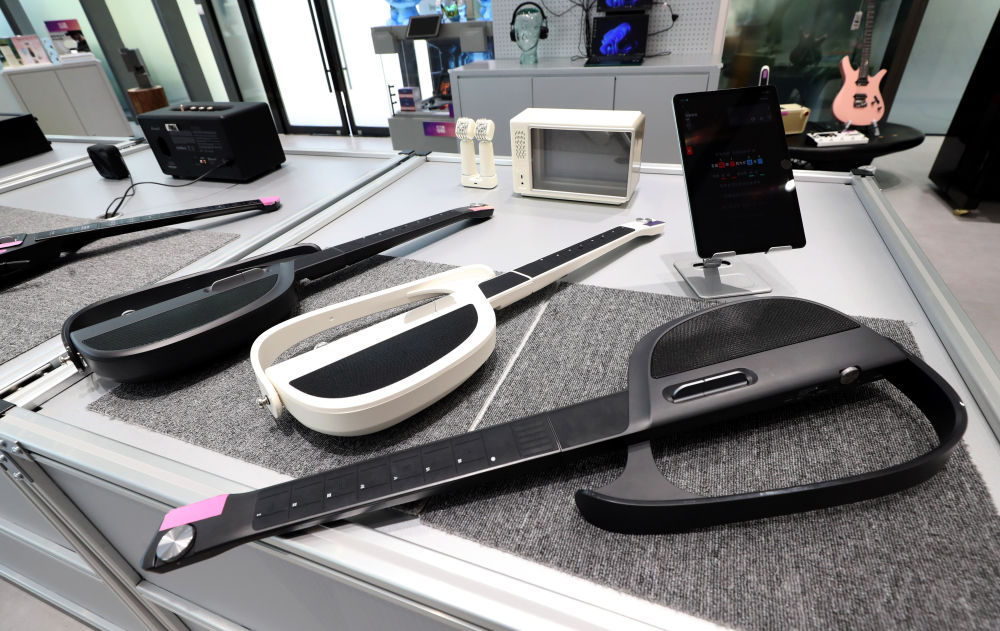 “模速空間”內(nèi)的人工智能產(chǎn)品體驗(yàn)店展出的智能吉他。新華社記者 方喆 攝