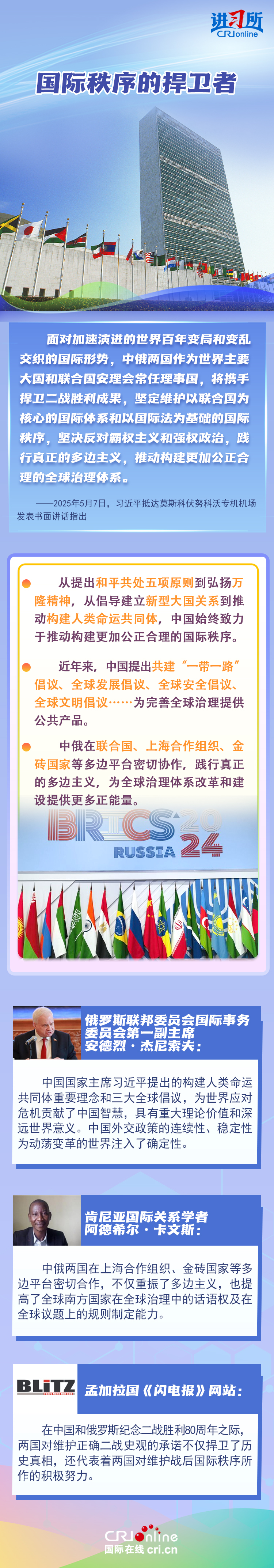 “兩國人民用鮮血和生命凝結(jié)的深厚情誼,如黃河之水奔騰不息,似伏爾加河寬廣深沉,成為中俄世代友好的不竭源泉?!苯衲晔侵袊嗣窨谷諔?zhàn)爭、蘇聯(lián)偉大衛(wèi)國戰(zhàn)爭暨世界反法西斯戰(zhàn)爭勝利80周年,也是聯(lián)合國成立80周年。在這一重要?dú)v史時(shí)間節(jié)點(diǎn),習(xí)近平主席此訪不僅為中俄關(guān)系發(fā)展注入強(qiáng)勁動力,也向世界宣示中俄兩國攜手捍衛(wèi)二戰(zhàn)勝利成果的堅(jiān)定意志。