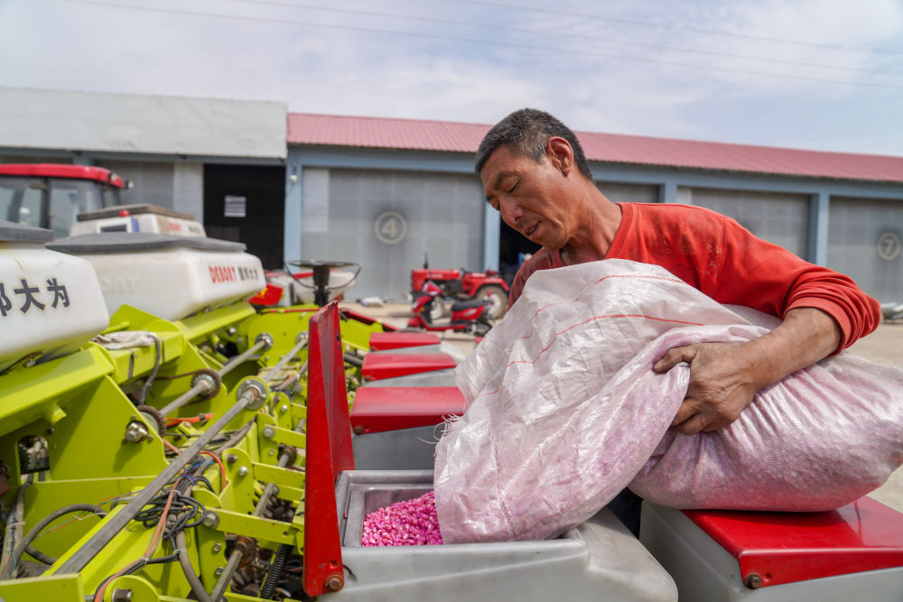 2020年5月7日,在吉林省四平市梨樹縣康達(dá)農(nóng)機農(nóng)民專業(yè)合作社,農(nóng)民向免耕播種機里投放玉米種子。