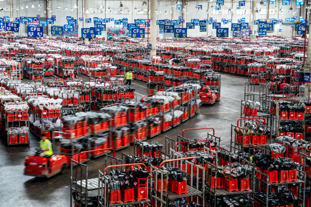 臺車在昆明國際花卉拍賣交易中心內(nèi)轉(zhuǎn)運鮮花(7月9日攝)。新華社記者 胡超 攝