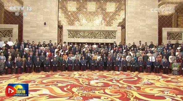 習近平等來到接見現(xiàn)場時,全場響起長時間熱烈掌聲。習近平向大家揮手致意,不時同代表親切交流,并同大家合影留念。