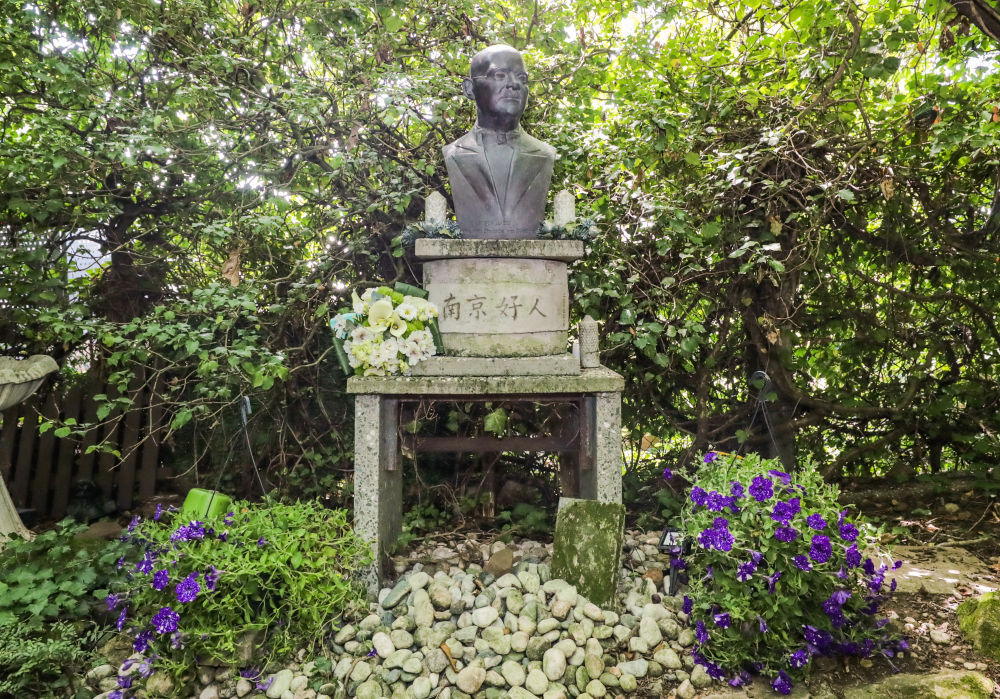 1950年,拉貝逝世,被安葬在柏林西郊。墓碑周圍是從南京移栽而來的竹子、梅花和菊花?;颁佊杏昊ㄊ?。墓碑前方矗立著拉貝半身雕像,其下立有紀(jì)念碑,用中德雙語鐫刻著:“感恩——永遠(yuǎn)銘記拉貝先生的國際人道主義善舉!中國·南京?!蹦骨皵[放著憑吊者送上的簇簇鮮花。