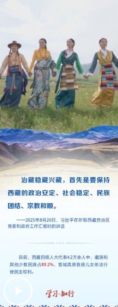 2025年8月20日,習(xí)近平總書記率中央代表團(tuán)乘專機(jī)抵達(dá)拉薩,出席西藏自治區(qū)成立60周年慶祝活動。在聽取西藏自治區(qū)黨委和政府工作匯報時,習(xí)近平總書記強(qiáng)調(diào),“持續(xù)深入抓好穩(wěn)定、發(fā)展、生態(tài)、強(qiáng)邊四件大事,努力建設(shè)團(tuán)結(jié)富裕文明和諧美麗的社會主義現(xiàn)代化新西藏”。