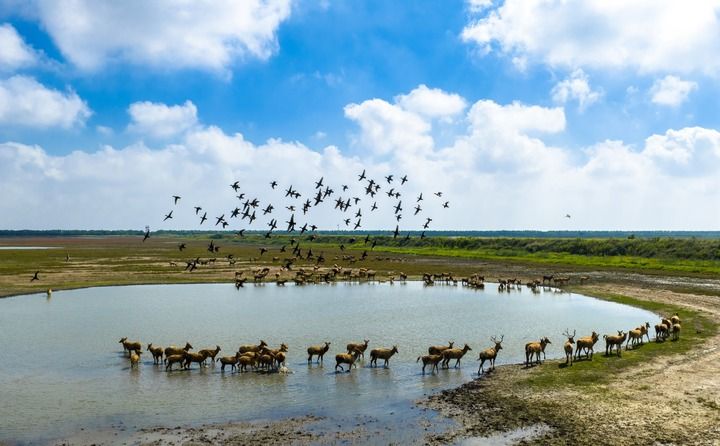 2025年10月11日,在江蘇東臺(tái)條子泥濕地,候鳥飛翔,成群野生麋鹿悠閑散步,一派人與自然和諧共生的生態(tài)美景(無人機(jī)照片)。新華社發(fā)(孫家錄攝)