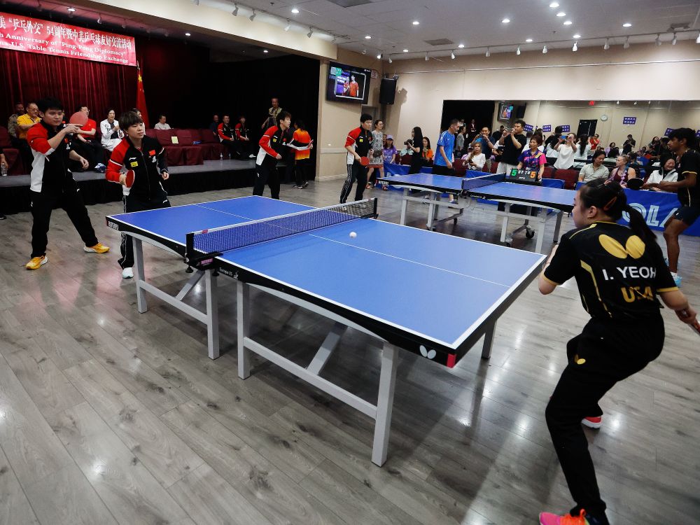 這是7月13日在美國內華達州拉斯維加斯拍攝的紀念中美“乒乓外交”54周年暨中美乒乓球友好交流活動現(xiàn)場。新華社發(fā)(邱晨攝)