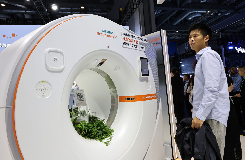 2025年11月6日,參觀者在第八屆進(jìn)博會(huì)醫(yī)療器械及醫(yī)藥保健展區(qū)西門子醫(yī)療展臺(tái)駐足觀看一款亞洲首發(fā)首展的CT機(jī)展品。進(jìn)博會(huì)是全球新品首發(fā)地,更被視為前沿技術(shù)“首秀地”。
