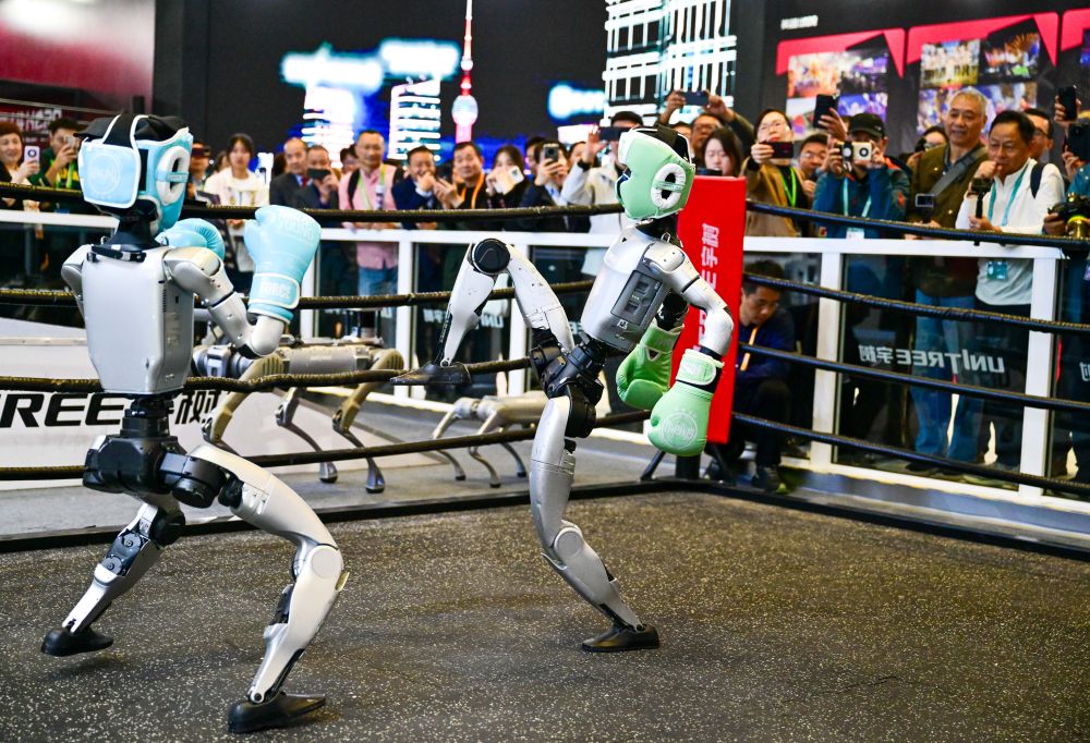 2025年11月6日,人形機(jī)器人在第八屆進(jìn)博會(huì)宇樹科技展臺(tái)進(jìn)行格斗表演。當(dāng)日,在技術(shù)裝備展區(qū)宇樹科技展臺(tái),兩臺(tái)G1人形機(jī)器人的格斗表演吸引了眾多觀眾。它們戴著護(hù)具及拳套,施展直拳、勾拳、左右鞭腿,展示倒地自主起身等復(fù)雜動(dòng)作,不時(shí)贏得觀眾喝彩。
