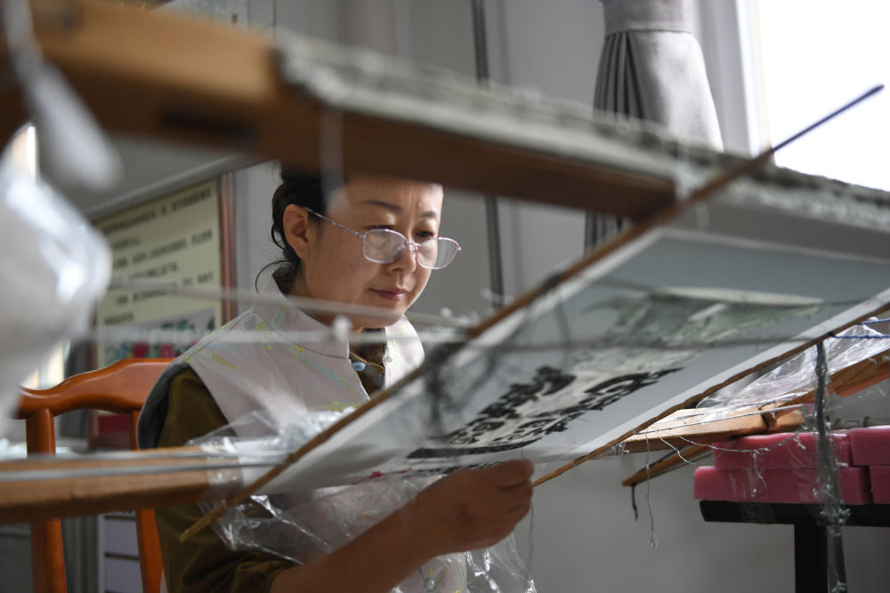 2023年9月8日,陜西千陽繡娘王紅燕在西秦刺繡文化產業(yè)園內刺繡。陜西千陽縣是國家級非物質文化遺產“西秦刺繡”的重要發(fā)祥地和傳承地。近年來,千陽縣將西秦刺繡作為助農增收的重要產業(yè),推動非遺項目產業(yè)化發(fā)展,助力鄉(xiāng)村振興。