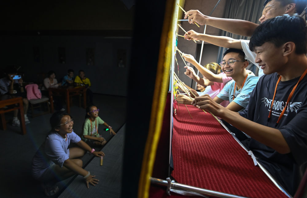 2023年8月8日,進行暑期研學的學生在位于西安的中國秦腔藝術博物館里體驗皮影戲演出。