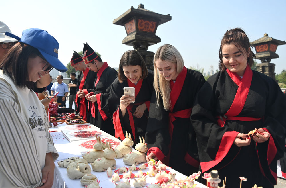2023年9月16日,“絲路起點 文明根脈”2023西安絲路留學生交流活動在西安啟動,來自西安交通大學的百名中外大學生著漢服、行漢禮,通過沉浸式體驗,了解中國傳統(tǒng)文化。這是中外大學生在交流活動上了解陜西非遺。