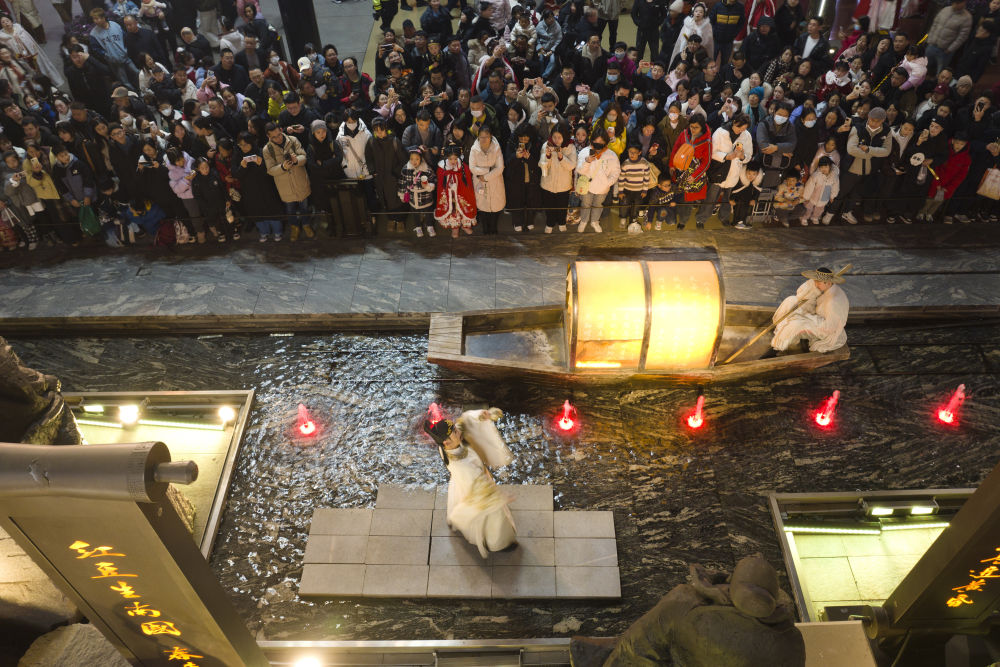 游客在西安大唐不夜城景區(qū)觀看以唐代歷史文化為背景創(chuàng)作的情景劇(無人機照片,2025年1月22日攝)。