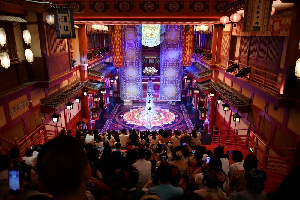 2024年5月12日,游客在西安長安十二時辰主題街區(qū)內觀看演出。街區(qū)通過漢服旅拍、演藝互動、非遺體驗等項目,讓游客“穿越”回盛唐長安,為游客打造科技感、文化味十足的游歷體驗。
