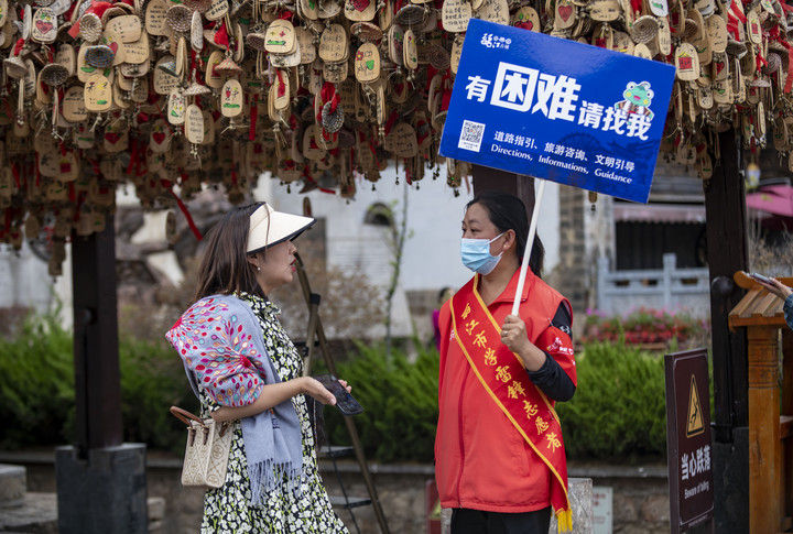 2023年5月18日,一名游客(左)在麗江古城向志愿者咨詢。2015年12月,云南麗江古城保護管理局牽頭成立了麗江古城旅游志愿者服務(wù)隊,志愿者主要來自市區(qū)機關(guān)單位、古城保護管理局、古城經(jīng)營戶、在校學生、社區(qū)居民等,常年在古城內(nèi)提供旅游咨詢、道路指引、文明引導等志愿服務(wù)。