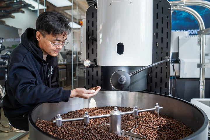 2025年12月10日,韓君瑋在位于昆明的南來盛咖啡店內(nèi)烘焙咖啡豆。
