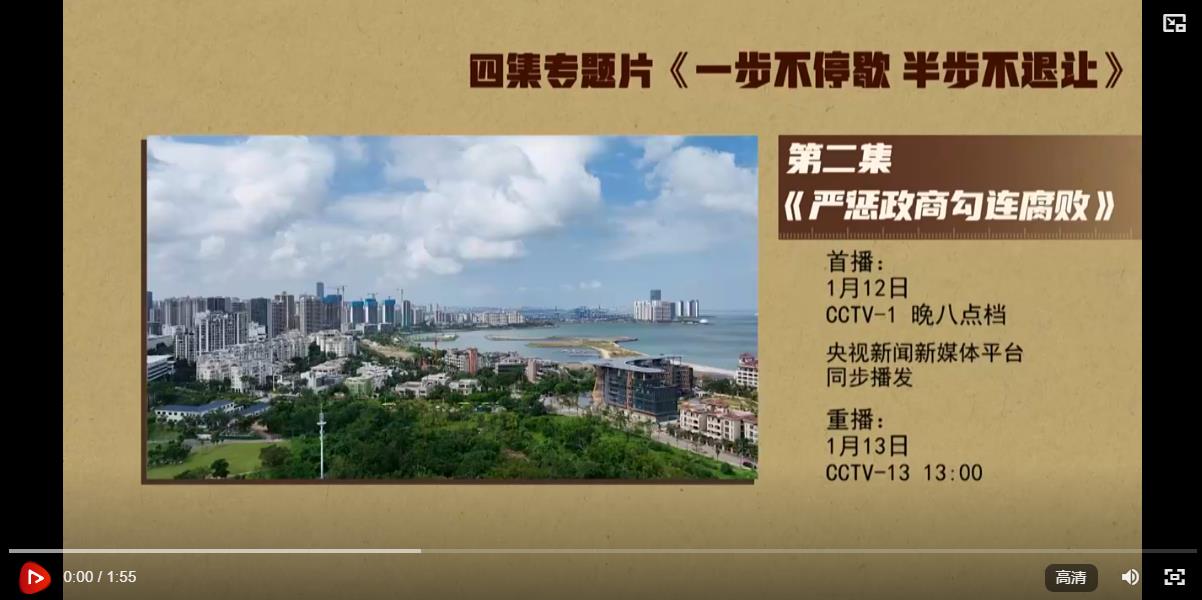 反對腐敗、建設(shè)廉潔政治,是我們黨一貫堅持的鮮明政治立場,是黨自我革命必須長期抓好的重大政治任務(wù)。要把嚴懲政商勾連腐敗作為攻堅戰(zhàn)重中之重,堅決打擊以權(quán)力為依托的資本逐利行為,堅決防止各種利益集團、權(quán)勢團體向政治領(lǐng)域滲透,不斷凈化政治生態(tài),推動構(gòu)建親清統(tǒng)一的新型政商關(guān)系,促進經(jīng)濟社會高質(zhì)量發(fā)展。電視專題片《一步不停歇半步不退讓》第二集《嚴懲政商勾連腐敗》,講述紀檢監(jiān)察機關(guān)聚焦政治問題和經(jīng)濟問題交織的腐敗案件,嚴懲以商養(yǎng)官、以官護商、官商一體等問題,堅決破除政商勾連“利益共同體”??偱_央視綜合頻道1月12日晚8點檔播出,央視新聞新媒體平臺同步播發(fā)。