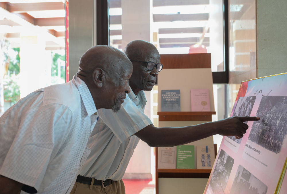 1月28日,在津巴布韋首都哈拉雷的中國大使館,兩名曾在中國接受培訓(xùn)的津巴布韋老戰(zhàn)士在展板老照片上尋找自己。當(dāng)日,大使館舉行向津巴布韋解放斗爭老戰(zhàn)士轉(zhuǎn)交習(xí)近平主席復(fù)信活動(dòng)。新華社記者 楊光 攝