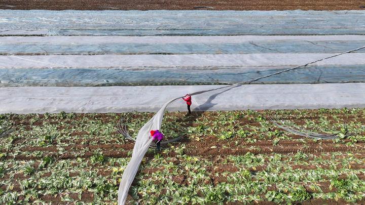 2025年12月11日,山東東營(yíng)廣饒縣,農(nóng)民為作物覆蓋防寒無紡布。